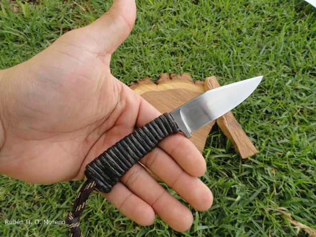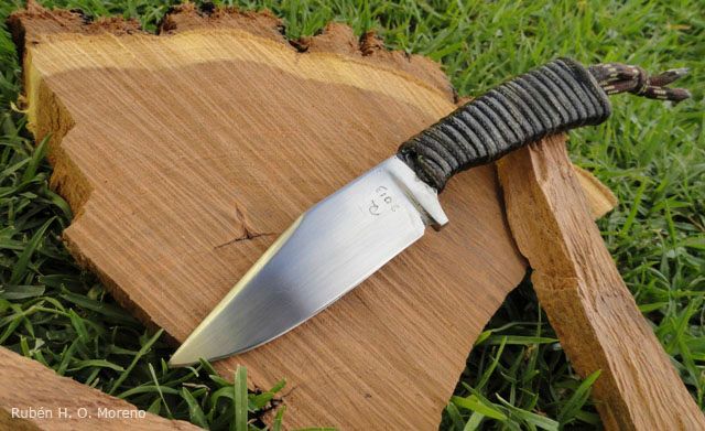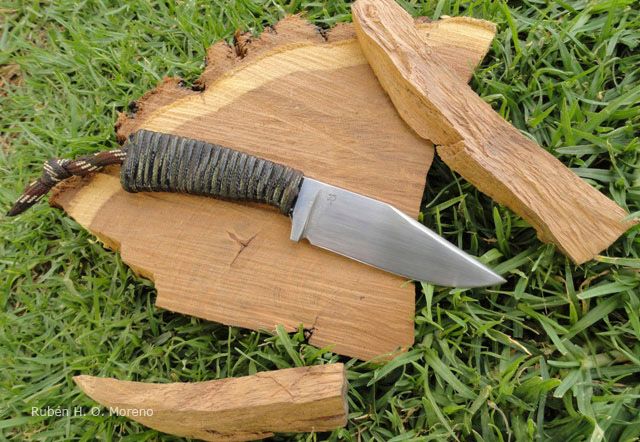 Realizado por desbaste en acero W2, Hoja tipo clip point, vaciado plano, acabado satinado y cabo encordado que brinda un muy buen agarre.